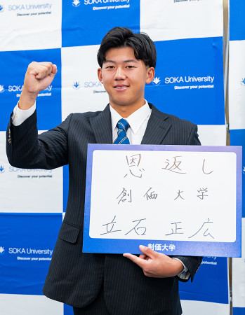 阪神から指名あいさつを受け、記者会見でポーズを取る創価大の立石正広内野手。「まずは1軍出場。全てのプレーで、もっともっと成長したい」と飛躍を誓った=24日、東京都八王子市 【時事通信社】