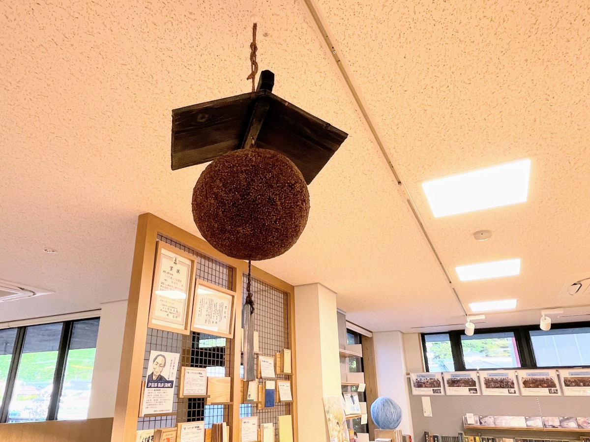 「ちえの森ちづ図書館」の天井からつり下がる、智頭特産の杉玉