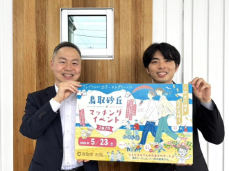 対象は20歳以上39歳以下の独身男女。開催時間は14時~17時。雨天時はアイエム電子鳥取砂丘こどもの国で実施。参加費は1,000円。申し込みは5月17日までウェブで受け付け、定員を超えた場合は抽選となる。