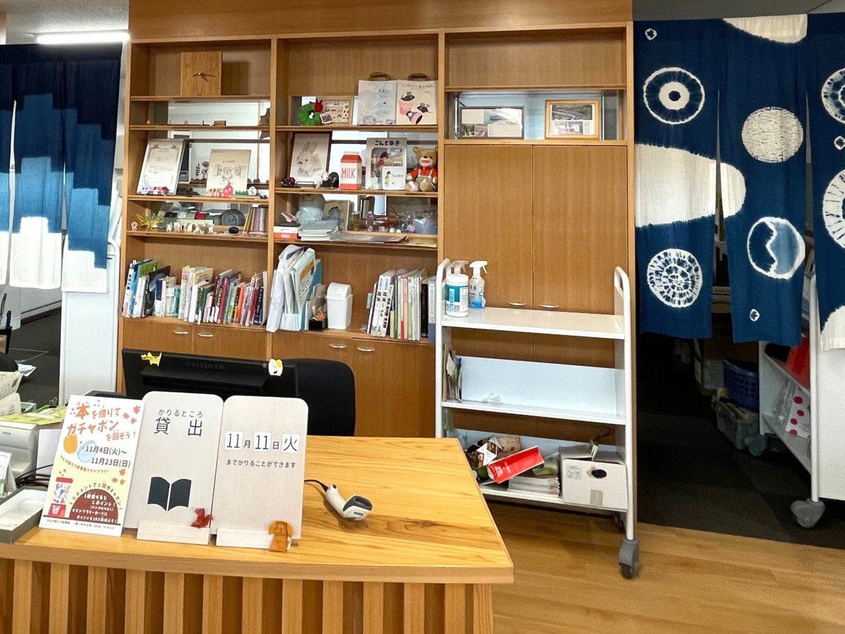 ちえの森ちづ図書館のカウンター背後にかかる、藍染ののれん