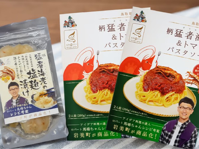 岩美町の特産品・ふるさと納税返礼品として新たに開発した商品「柄猛者海老(がらもさえび)&トマトのパスタソース」「柄猛者海老の塩麹(こうじ)漬け」が12月20日に発売され、同日、道の駅きなんせ岩美(岩美町新井)で発表会と試食会が開かれた。