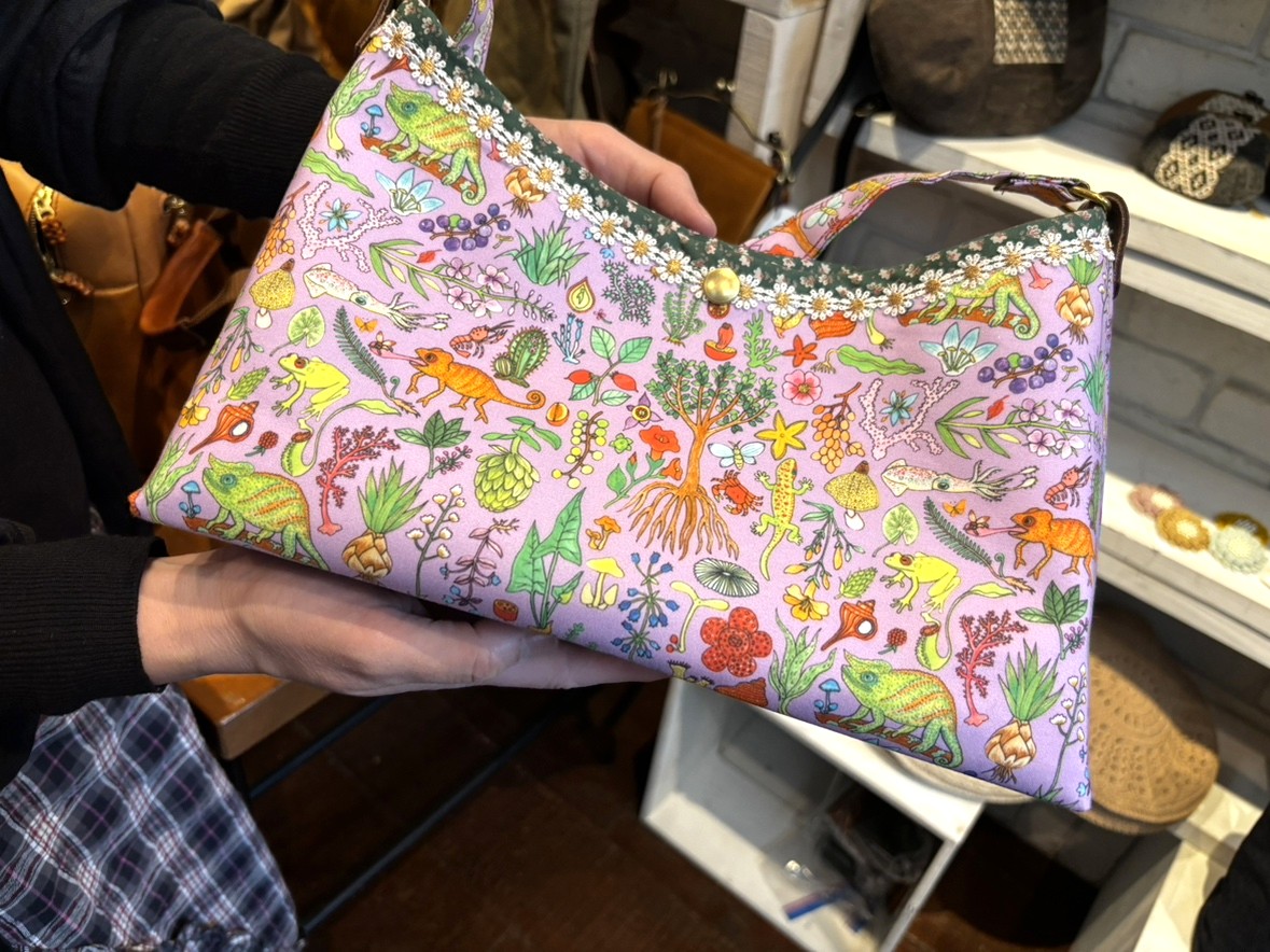 「gallery shop SORA」の鞄展で取り扱う「カエル工房・手のひらワークス」さんの描いた絵を元にプリントしたオリジナル生地で作ったバッグ