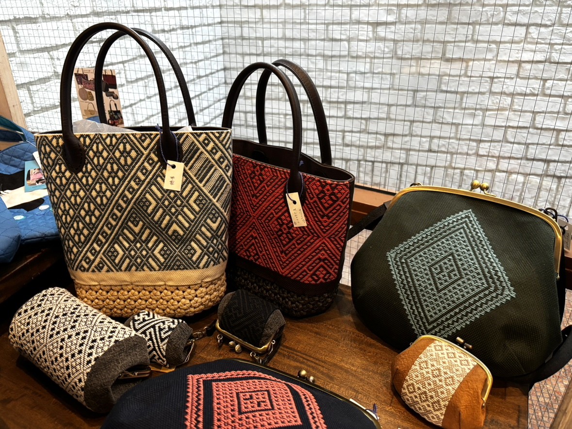 「gallery shop SORA」の鞄展で取り扱う「穂香」さんの刺し子のバッグなど